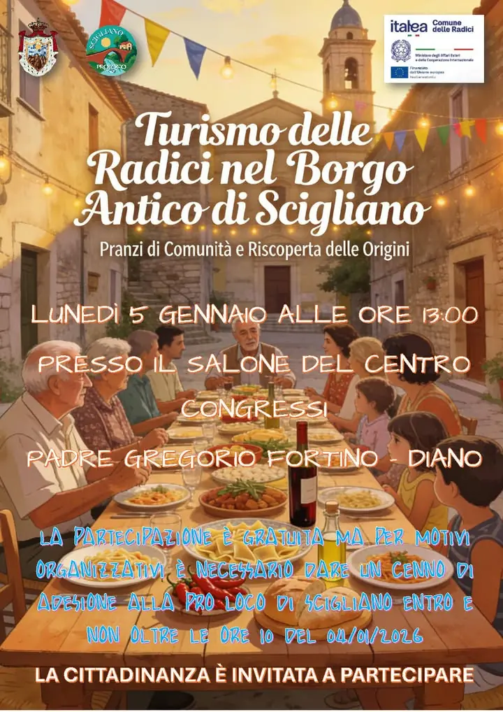Nell’ambito del progetto “Turismo delle Radici” promosso dal Ministero degli Affari Esteri, il Comune di Scigliano, in collaborazione con la Pro Loco, organizza un “Pranzo di Comunità e delle Radici”. L’evento si svolgerà presso il Salone del Centro Congressi Padre Gregorio Fortino – Diano il 5 genn